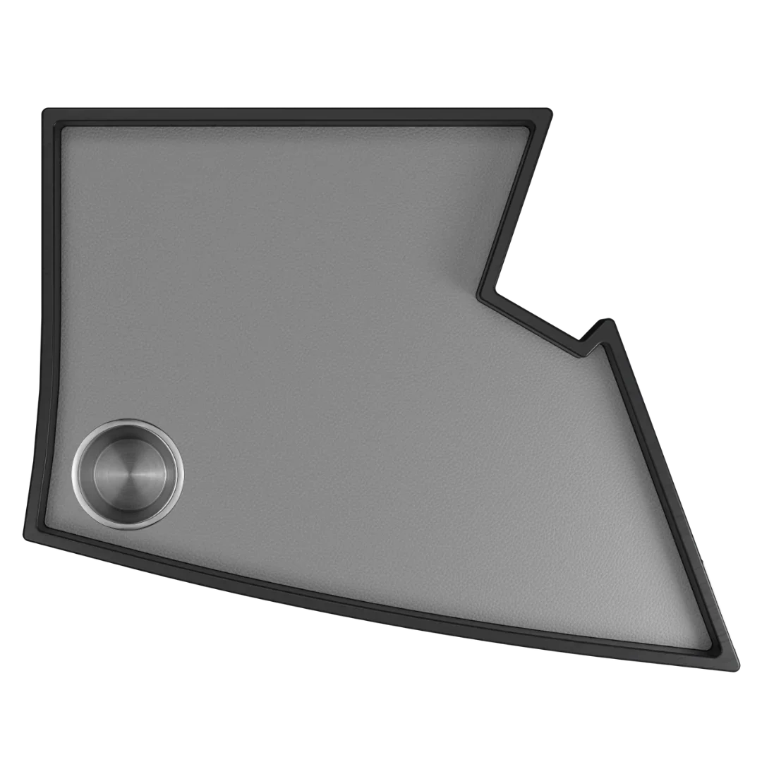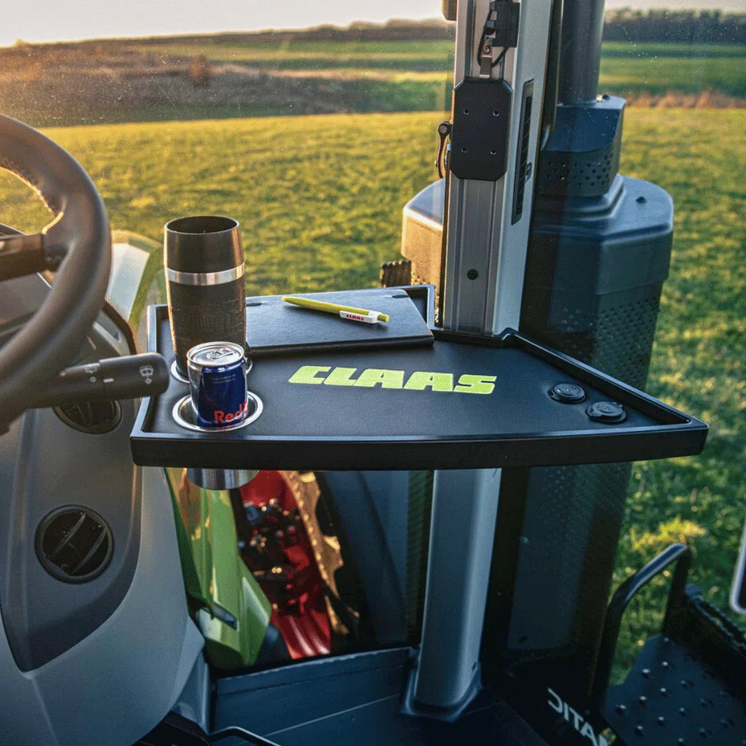 An exclusive, hand-built tractor cab table, designed to fit on the right A-pillar of your tractor, providing extra storage space and practical features to make your daily life as a farmer easier.